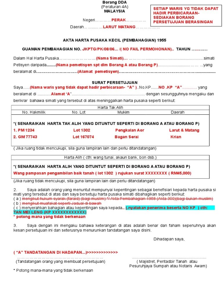 Peguam shah alam cara mengisi borang dda harta pusaka youtube. Panduan mengisi borang surat persetujuan harta pusaka kecil d.d.a.tetuan nur maidin & co adalah sebuah firma guaman dalam pengurusan harta . Harta pusaka pesuruhjaya sumpah gelang patah johor facebook. 7/16/2019 contoh panduan borang dda 1/2borang dda(peraturan 4a)malaysianegerikelantandaerah.pasir masakta harta pusaka kecil (pembahagian) 1955guaman . Borang dda adalah borang persetujuan yang perlu dilengkapkan oleh waris yang tidak dapat menghadiri bicara pusaka kecil.